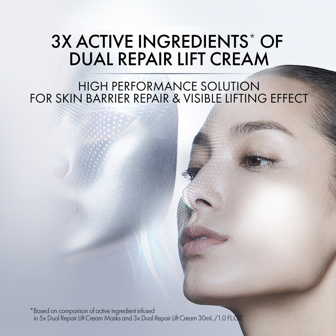 ¹Based on comparison of active ingredient infused in 5x Dual Repair Lift Cream Masks and 3x Dual Repair Lift Cream 30 mL.