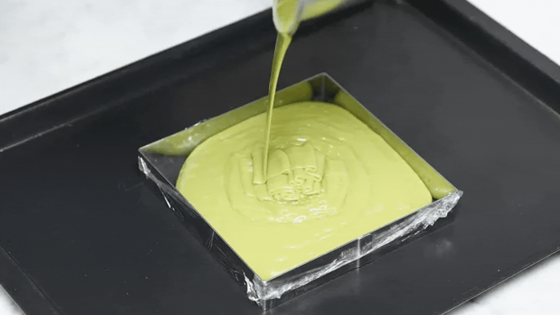 2. ベーキングシートを敷いたトレイに流し込み、軽くたたいて気泡を抜き、表面を平らにします。