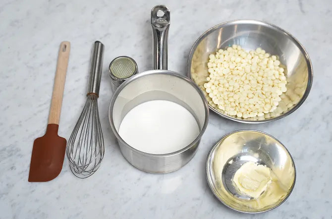 端に泡が現れます。 - ホワイトチョコレートを注ぎ、滑らかになるまでかき混ぜます。