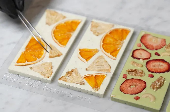 3. チョコレートが固まる前にトッピングを加えます。色や質感を混ぜ合わせると、より美しい仕上がりになります。