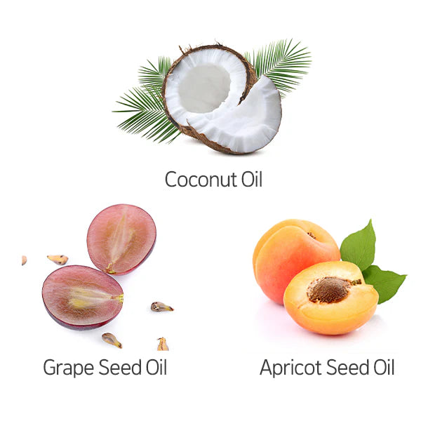 ココナッツオイル、グレープシードオイル、アプリコットシードオイルが死んだ細胞を除去し、清潔で優しい肌に導きます。